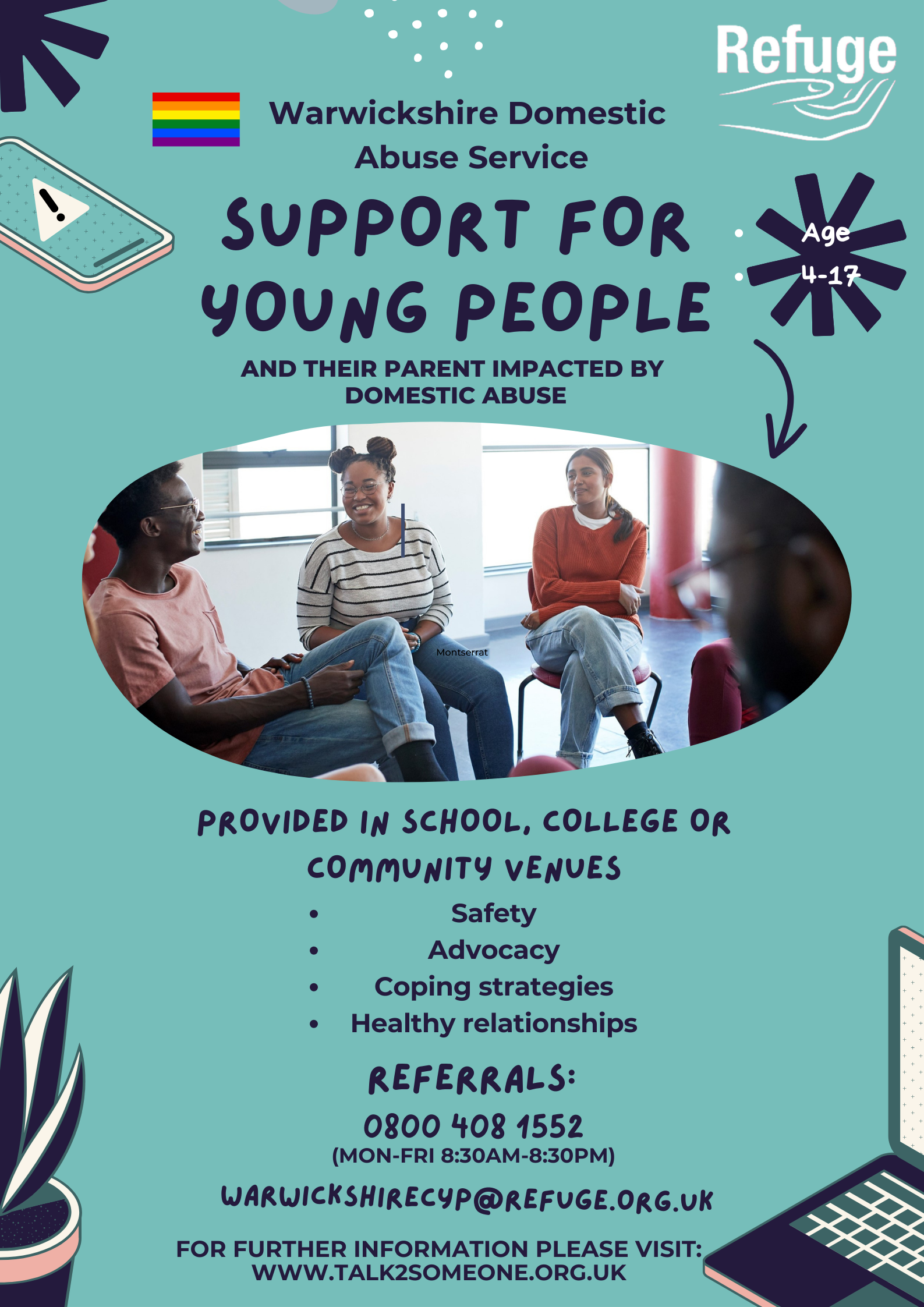 The Warwickshire Domestic Abuse Children’s Service provides support for children aged between 4 and 17 who have experienced or witnessed domestic abuse.